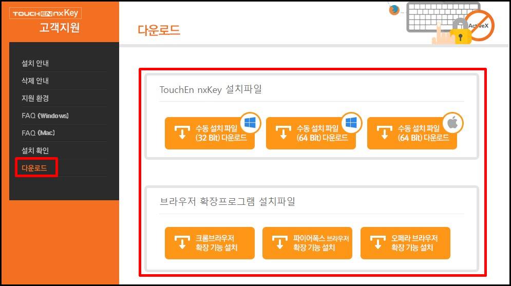 다운로드를 클릭한 후 TouchEn nxKey 설치파일 및 브라우저 확장프로그램을 설치해주세요.