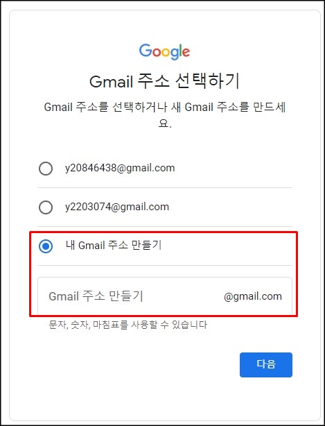 자동으로 생성된 메일 주소가 나오는데 그냥 무시하고 [내 Gmail 주소 만들기]에 체크 후 사용할 메일 주소를 만들면 됩니다.