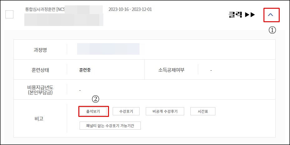 3. 수강 중인 훈련과정을 클릭 후 [출석보기]를 눌러 주세요.