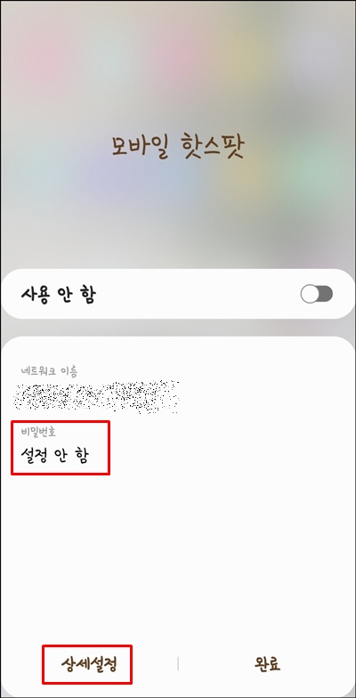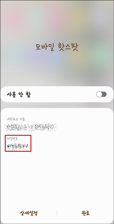 모바일 핫스팟 비밀번호를 설정했기 때문에 노트북이나 PC에 연결하여 이용하려면 설정한 비밀번호를 입력해야 합니다.