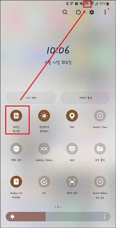 모바일 핫스팟을 누르면 아래 사진과 같이 상단에 모바일 핫스팟 연결 모양이 표시됩니다.