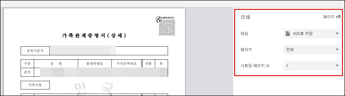 가족관계증명서를 PDF로 저장하기 위해서는 인쇄를 눌러 대상을 [PDF로 저장]으로 선택하면 됩니다.