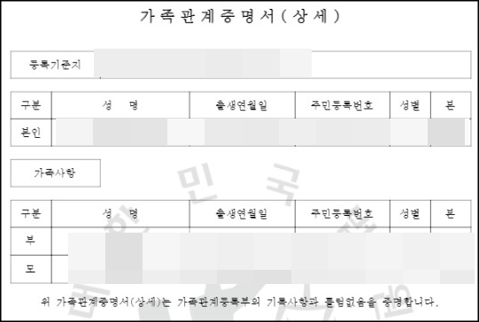- 상세증명서 : 본인과 부모, 배우자, 모든 자녀 표시(①에서 가족 선택 후 ③에서 상세증명서 선택 시 나의 형제. 자매도 표시가 됨)