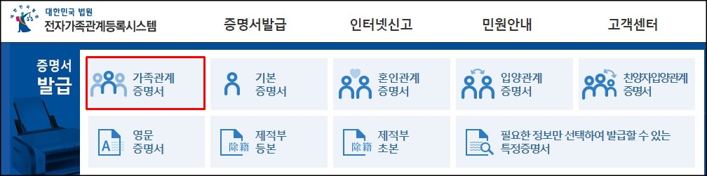 가족관계증명서 발급은 정부 24나 대법원 전자가족관계등록시스템에서 할 수 있습니다.