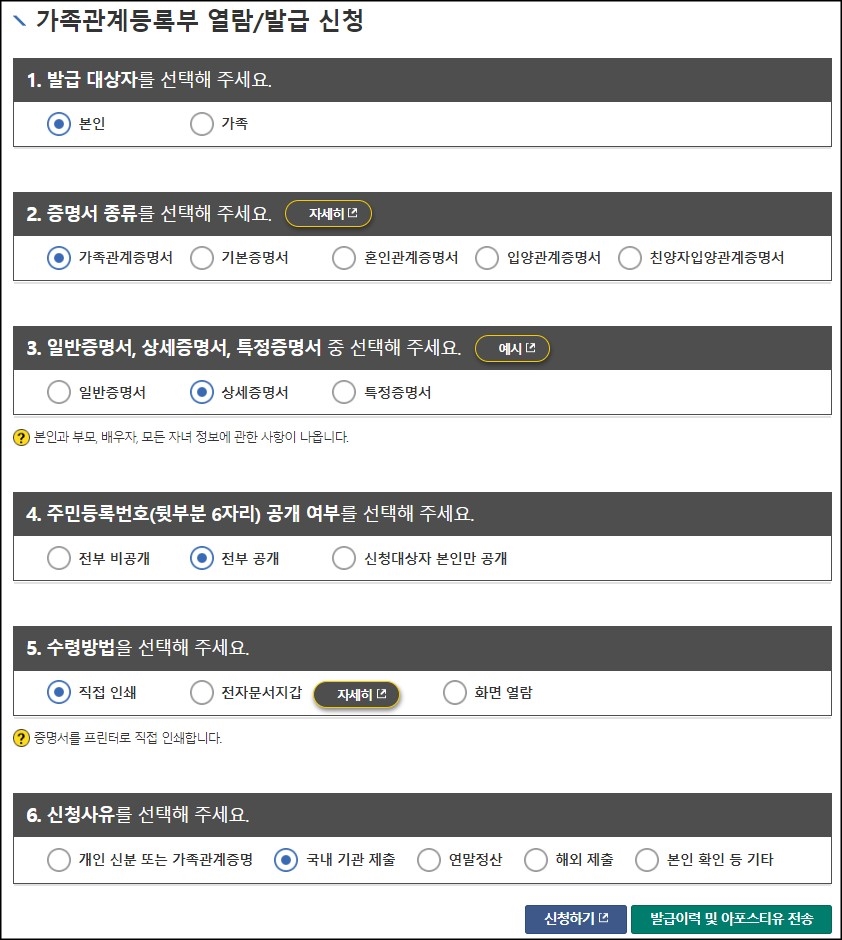 ① 발급대상자 : 기본은 본인, 형제. 자매까지 나오게 하고 싶다면 가족을 선택한 후 부모 중 한 분을 선택