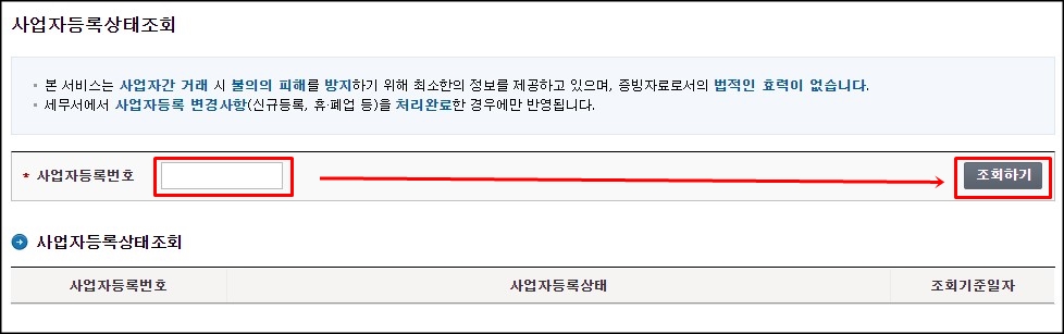 3. 사업자등록번호를 입력한 후 [조회하기]를 눌러주세요.