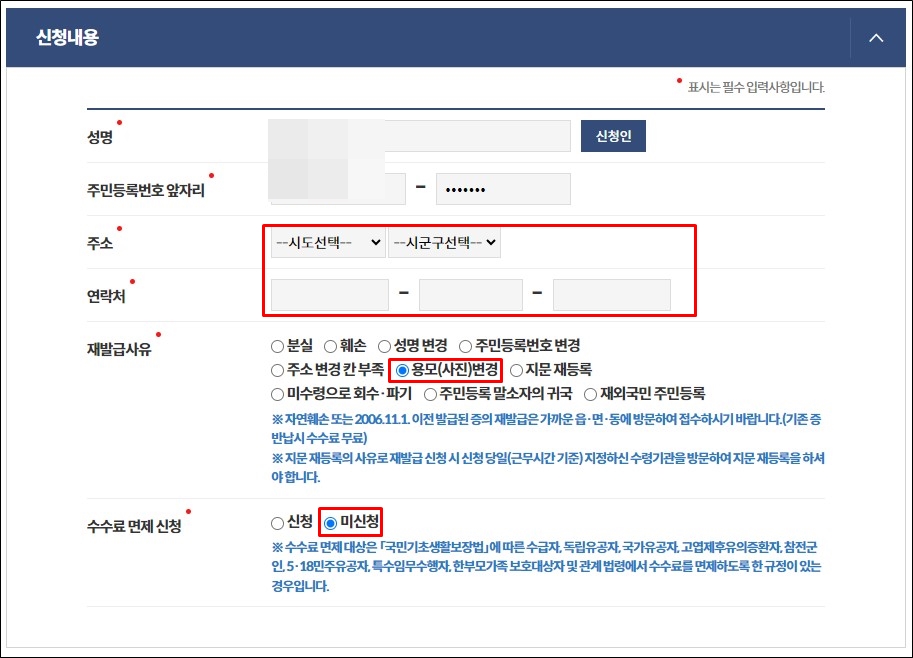 주소, 연락처, 재발급 사유, 수수료 면제 신청 부분만 신규로 작성하면 됩니다.