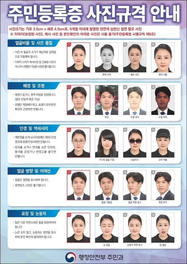 사진은 6개월 이내에 촬영된 사진으로 가로 3.5cm, 세로 4.5cm의 모자 등을 쓰지 않은 상반신 사진만 허용됩니다.