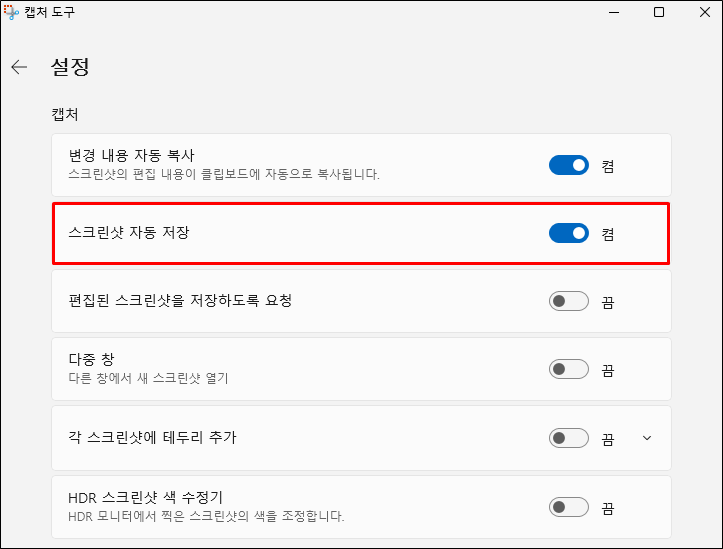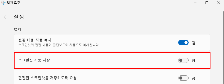 3. 스크린샷 자동 저장 취소를 위해 '끔'으로 바꿔줍니다.