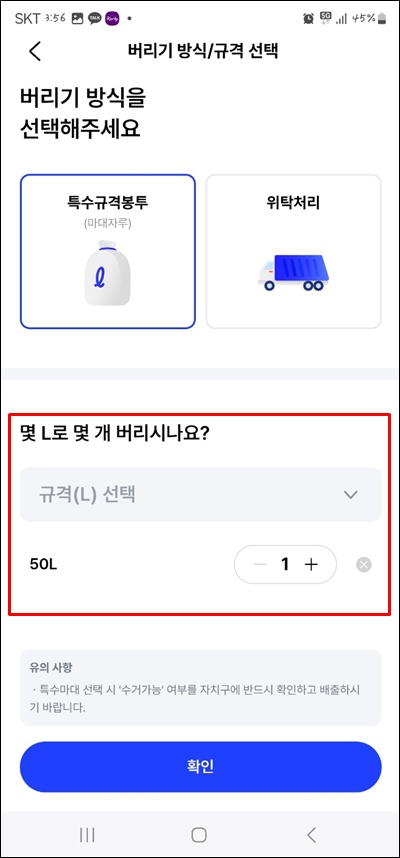 저는 특수규격봉투(마대자루)를 선택했습니다.