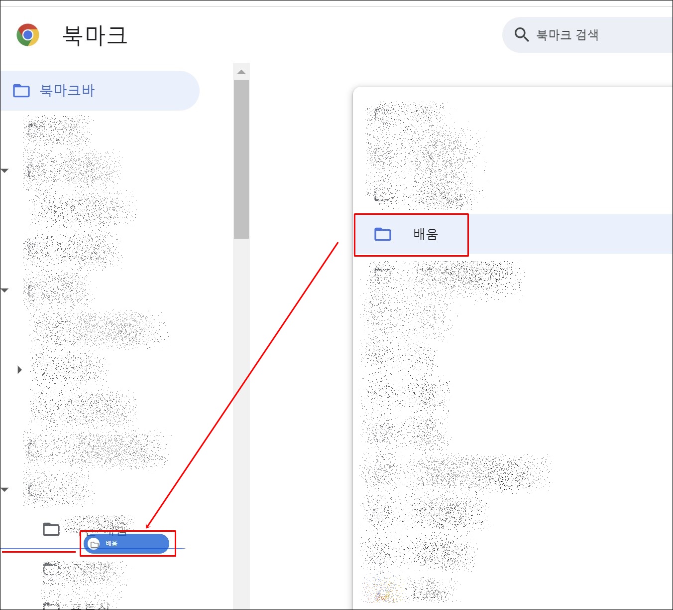 ③ 상위 폴더를 다른 상위폴더 안에 넣기 : 오른쪽 폴더 중 이동시킬 폴더를 마우스로 클릭한 상태에서 원하는 위치에 끌어 옮김 (이동시키려는 위치에 파란색 줄이 표시됨)