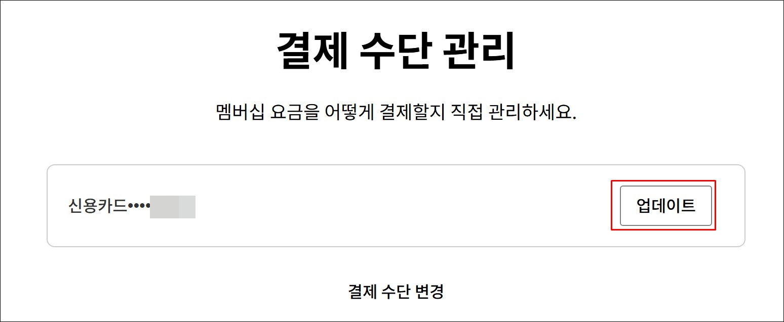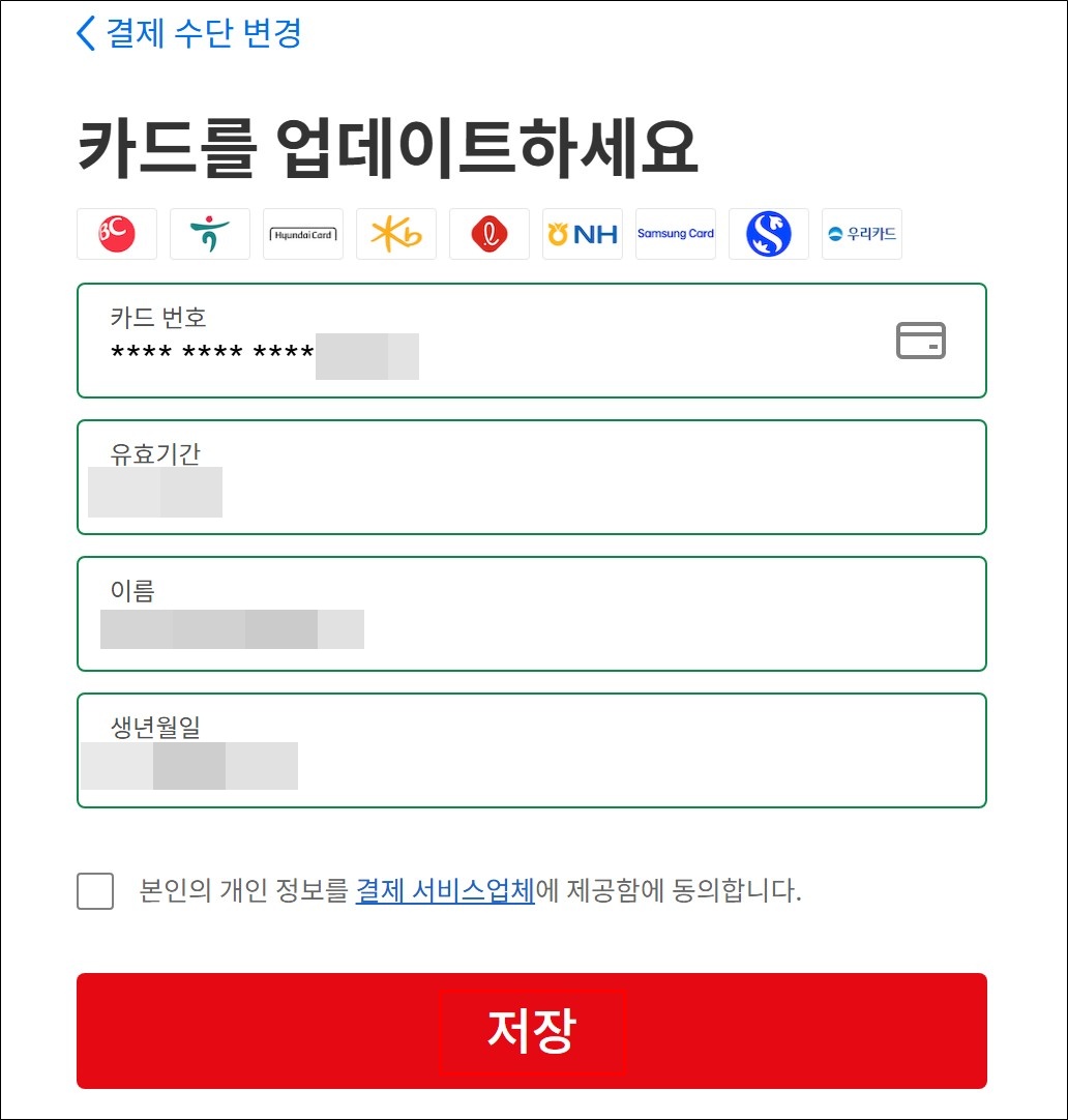 최초 등록한 카드의 유효기간이 만료되거나 분실 재발급 등의 사유가 생겼을 경우 카드번호를 변경해야 합니다.