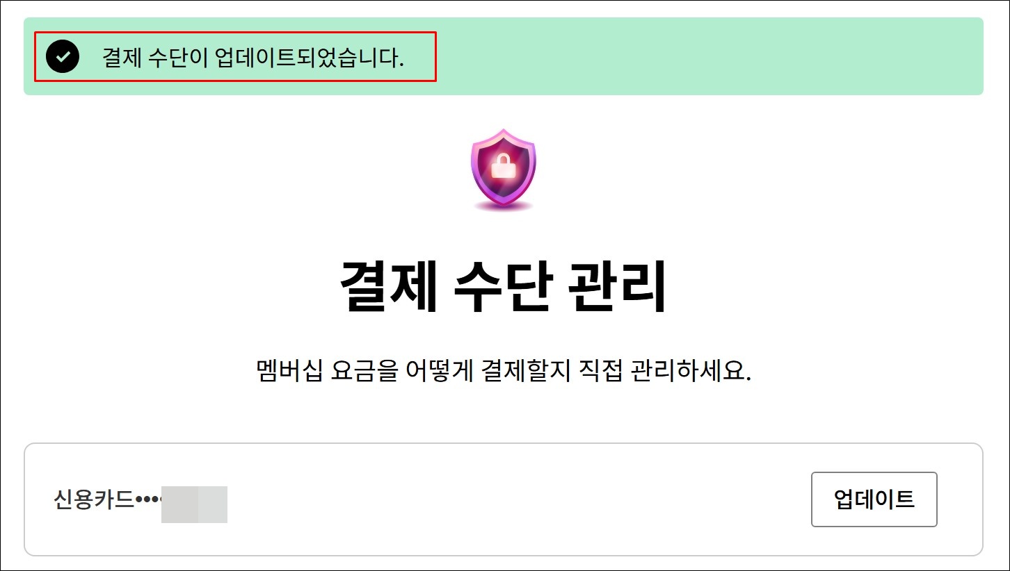 카드정보에 문제가 없다면 아래와 같이 "결제 수단이 업데이트되었습니다"라는 문구가 뜹니다.