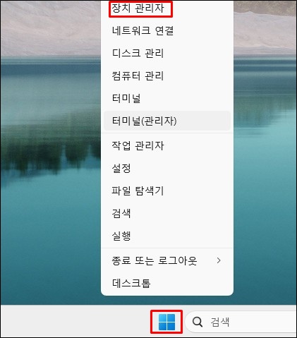 1. [시작 → 마우스 '우'클릭 → 장치 관리자]를 눌러주세요.
