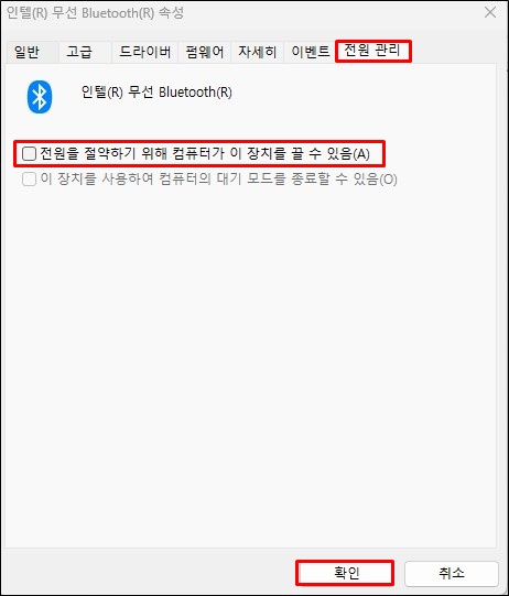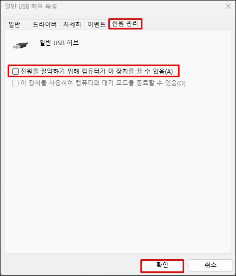 4. 속성창의 '전원관리'탭으로 간 후 [전원을 절약하기 위해 컴퓨터가 이 장치를 끌 수 있음]에 체크되어 있는 것을 풀고 '확인'을 누릅니다.